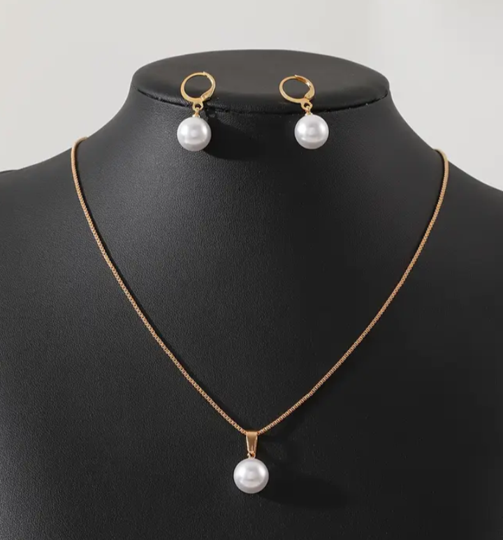 1 Set Elegant Fashion Jewelry, 3pcs Imitation Pearl Pendant Necklace and Earrings Set, Alloy Golden Finish, Ideal for Daily Wear and Party Accessory, Perfect Gift for Birthdays